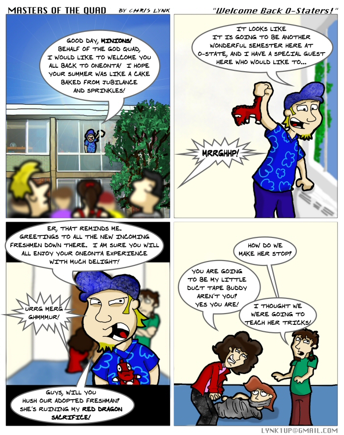 I, Lynk, would like to welcome you all back, and welcome any of you who might be brand new to Oneonta State. I expect you all to have a year drenched in awesomesauce, and may you find a short line for your SAC Cards!